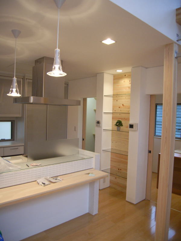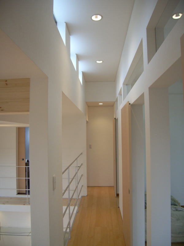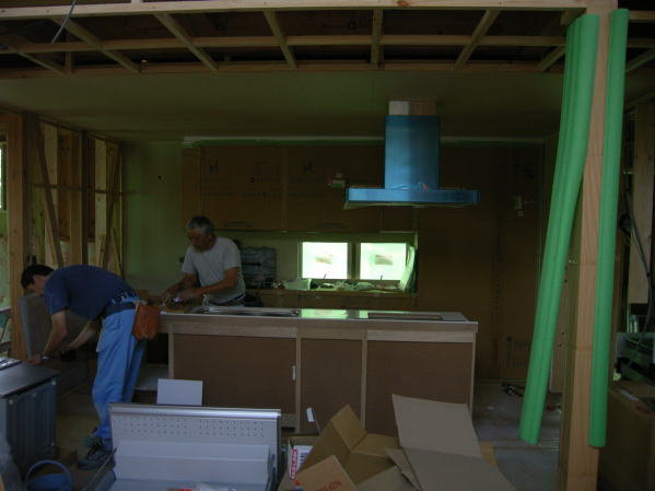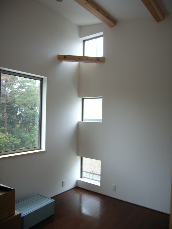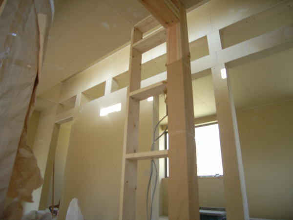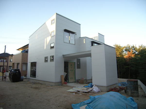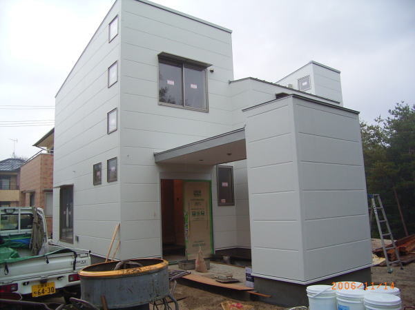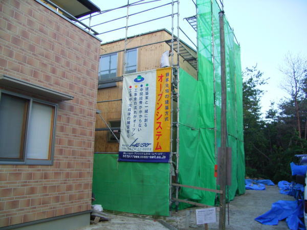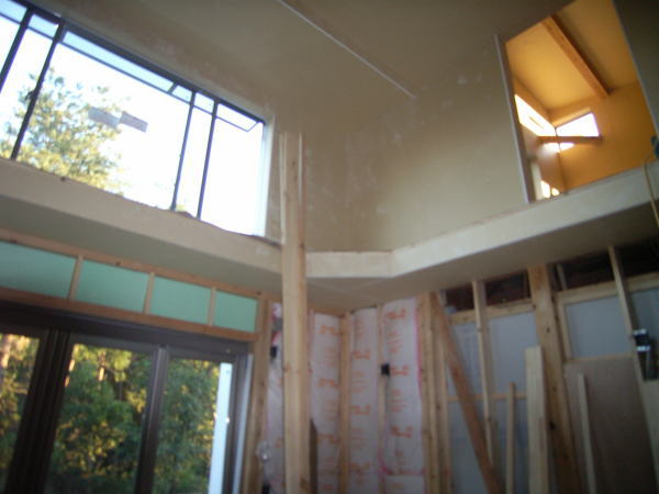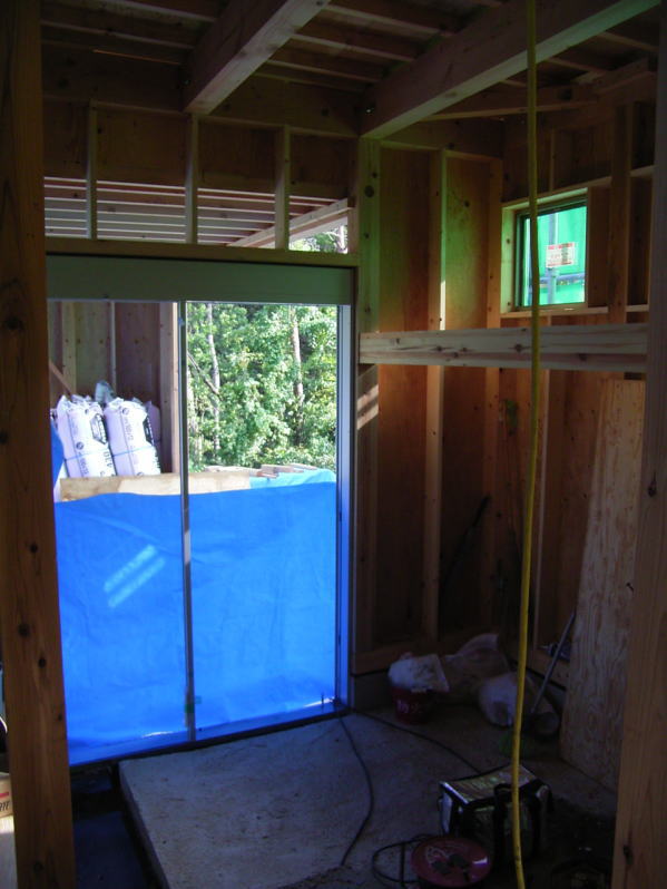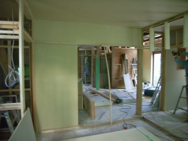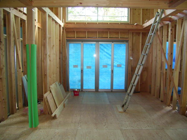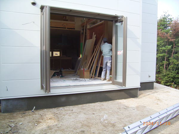 今日は堀田ガラスさんによる、サッシの搬入です。 上の写真は全開口サッシです。4枚のガラスが2枚ずつ外に折れて、 全開口になります。半分しか開かない引き違いと違い、開放感にあふれています。ちょっと高価な物ですが・・。 下の写真は玄関引き戸です。枠に傷が入ってしまい、交換してもらっていたため、建具はまだ入ってません。左側に透明のガラスがはいります。 いろいろなサッシメーカーがありますが、このトステムは意匠性にすぐれている気がします。養生シートをはがすのが楽しみです。 あと、引き違い戸は部屋の内部から外す事ができます!!(今までは外からしかサッシを外せなかった) 施工性も抜群に良いし、何より、住み始めた後の掃除が簡単になります。 いろいろなメーカーが様々な改良をしていますね。 ガラスは4mm+4mmのペアガラスです。最近では割と一般的になってきました。 | 次のページ>>