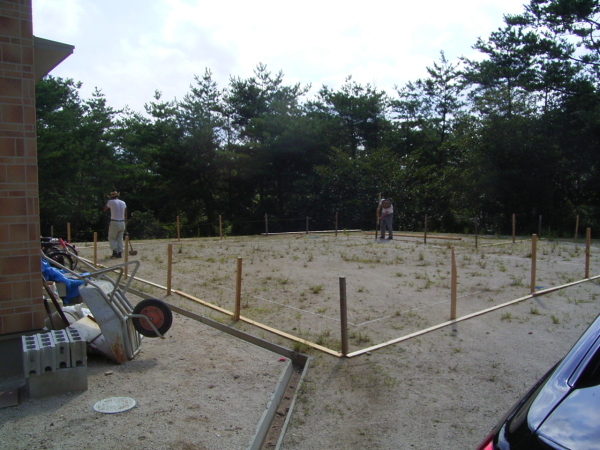 今日は基礎屋のウエヒラ建設さんによる、遣り方です。丁張りとも言いますが、これからの建築にあたり正確に建物の位置を表す為の物です。四方に同レベルの板を回し、糸を張り、基準となる線を作っていきます。この遣り方どおりに施工するのも重要ですが、遣り方自体が正確でないと、基礎と土台がずれたりするので、より慎重に作業を行います。